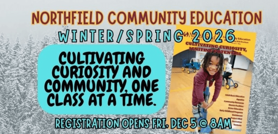 Community education brings our community together. We offer programs that develop skills, inspire creativity and promote healthy living. Check out our wide range of programming for infants through adults by clicking the button or categories below. If you see something you like, go ahead and add it to your cart and then create an account at checkout. Weather CancellationsPlease use this link to view current class changes due to weather. Adult Recreation Aquatics, Martial Arts, Sports, Leagues and Strength & Fitness for adults Adult Enrichment Arts & Literature, Dog Training, Language, Personal Finance, CPR and General Interest Drivers Education Classroom sessions and Behind the Wheel driver's training for students ages 15-18 Youth Recreation Aquatics, Martial Arts, Sports and Strength & Fitness for youth Pre-K to grade 12 Youth Enrichment Arts, Music & Theater, STEM, Health & Safety and more for students in elementary, middle and high school ECFE Parent/child classes for families with children ages birth to kindergarten Early Childhood Screening Screening by an early childhood teacher or nurse, tailored for your child's age Project ABLE Programs designed for adults with differential cognitive, physical and social abilities Facilities District building and facility rental. Please review calendar before submitting your Northfield Public Schools facility rental request. Early Ventures Childcare Learning Center for infants to preschoolers, licensed by the Dept. of Human Services*Openings for the Year Before K for 2025-2026. All other classrooms are on a waitlist for 2025-2026 Hand in Hand Preschool Licensed teachers preparing children ages 3 to K entrance for continued success Kid Ventures School age enrichment and care for after school, late start and non-school days Sponsor a KidMake learning and FUN possible for all kids by donating to our scholarship fund! Your gift will directly sponsor a local child for a youth class or activity offered by Northfield Community Education Contact Us Call Main Office: 507.664.3649Weather Cancellations: 507.664.3659 Visit Northfield Community Education Center (NCEC)700 Lincoln ParkwayNorthfield, MN 55057 Hours Monday-Friday8:00am-4:30pm Looking to Pay a Bill? You can find your bills for childcare, preschool, facility rentals and more by logging into your account. Log In Now Northfield Public Schools Community Education often takes photographs of classes or programs to use in brochures and on the web, including social media. If you do not want pictures of you or your child used, please call our office at 507.664.3649 to 'opt out.' Northfield Public Schools Community Education does not provide accident insurance for participants in any of its programs or activities. Participants assume all inherent risk of injury resulting from their involvement in programs or activities.